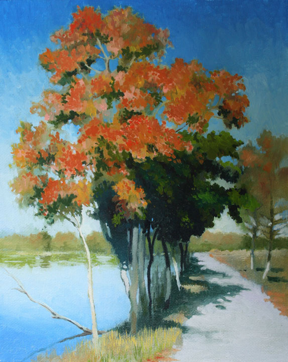 It is 4:30 pm, bright and hot outside. Suddenly I heard the sander. Of course I rushed outside. Very masculine white cloud is growing rapidly against the most beautiful blue sky. It is summer. The tv said that there are 20% chance of rain today. It is very strange that I was painting autumn tree inside.