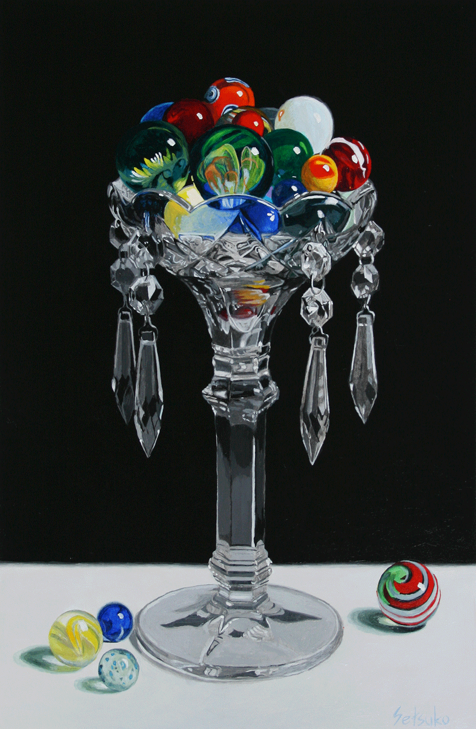 I started to go to the antique and vintage auctions these days. The specific one I go lasts just about all day. There are so many interesting objects. Gradually I started to talk with some people who are usually the antique dealers. They are very kind and bored, and often give me much information about everything. This is better than going to school I think…anyway, I purchased quite a lot of things in this auction. Most of them are absolutely no use for everyday life but fun to see. This glass candle holder is one of the pair I purchased a couple weeks ago. It is not old but Irish crystal and very pretty. After I painted this image, I do not know what to do with it. I just need to paint more with this.