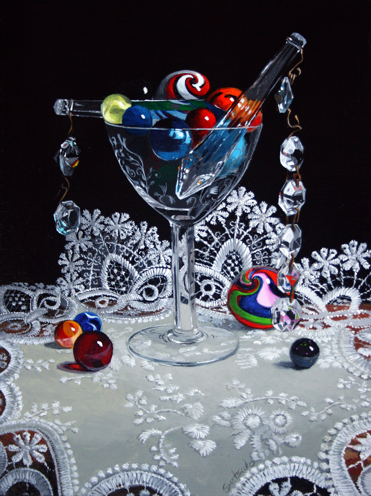 My friend Debbie gave me her grandmother’s glass. I am not sure if this glass is wine glass, vintage champaign glass, or something else. But it sure is pretty. I was shaken with joy when I found those beautiful glasses in a package from her. Thank you Debbie. I finally found the doily for this glass and painted the first version.