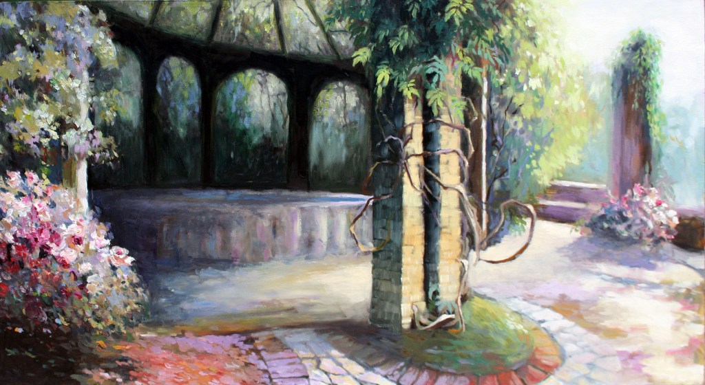I visited one of the antique store last week. But I was not looking for any particular items. It is always such a fun to check out all those odd things. Sometimes I do not know what I am looking at. Anyway I saw one of the most decorative but well done painting….actually a print. Beautiful colors and incredible brush strokes were there. Of course I bought it and studied the masterfully painted image. I started to feel like I need to try the way this artist painted. I took out one of the photos of the Gray Tower in PA. I changed the composition…well…just about everything and recreated this image. It was fun! I did not need to worry about the details or accuracy of what I was looking at. I just painted whatever I feel like.