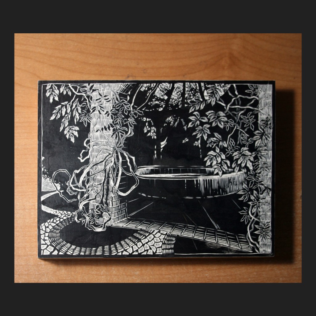I started a new painting as soon as I finished the one I posted yesterday. It is nice to have a husband who is off from his work during the summer and loves to cook. Thank you! I did not do anything but painting for past few days. Also I started cleaning my work area this morning. I found many odd things which I totally forgot about. This wood engraving block is one of those things. I stopped this image almost one year ago because I did not know what to do with it. Now I look at this block with rather detached eye and think finishing it. I also start working with digital drawing and sequential art. Also I am working on my web site for Central Pennsylvania art show which is all on-line. Wow I am multitasking! or rather scattered mind.