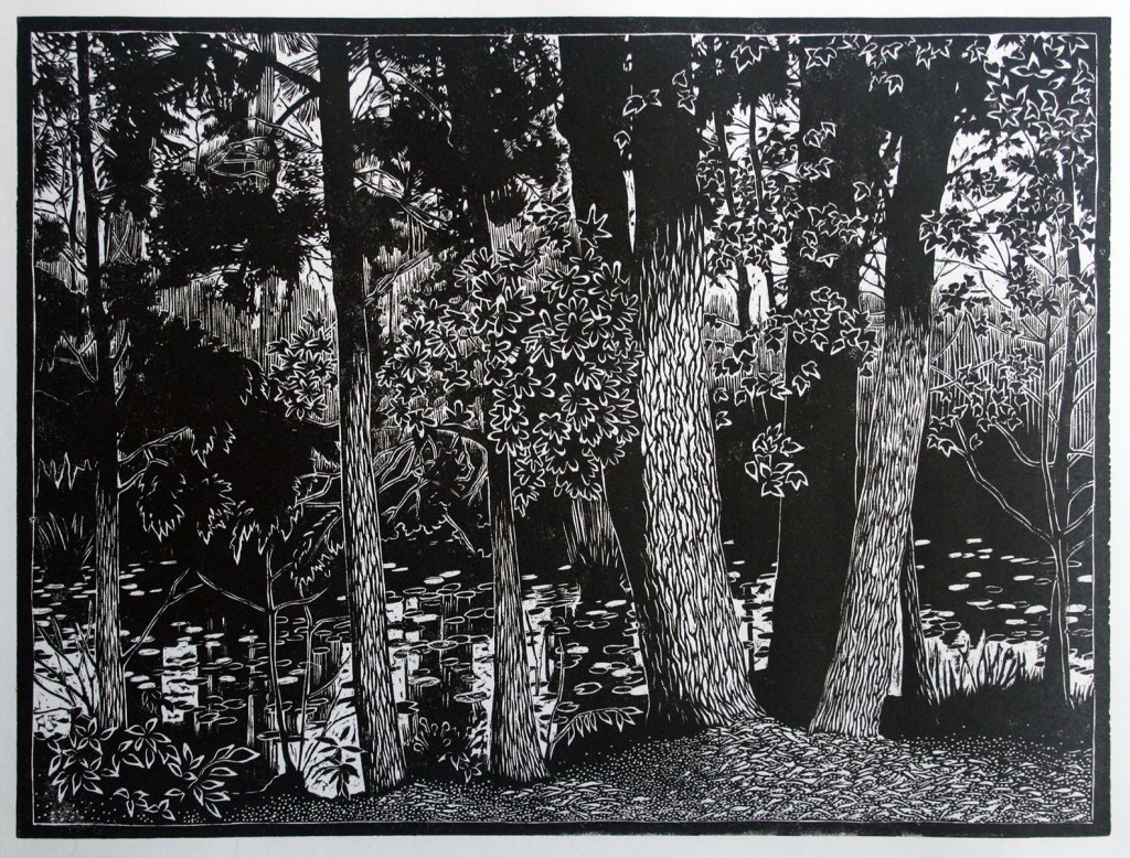 This is the image I just finished and printed yesterday. I think that I started to understand the value patterns created with curved white lines on black block. When I draw, I can build up the layers with erasing smudging, and redrawing. Here when I chisel, all value patterns are determined by the visual mixture of black and white. Those grays created by visual mixture also indicate the different textures. I realized it is almost like solving a puzzle when I was working on this image.